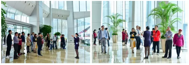 大廈大堂內(nèi),大廈客服正在熱情地向業(yè)主們介紹建發(fā)集團(tuán)及其發(fā)展歷史