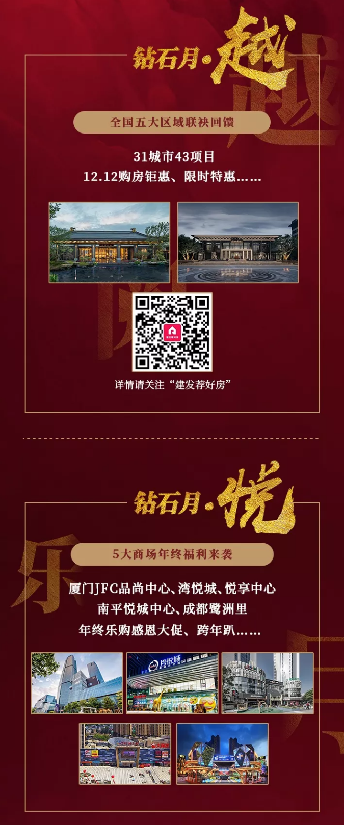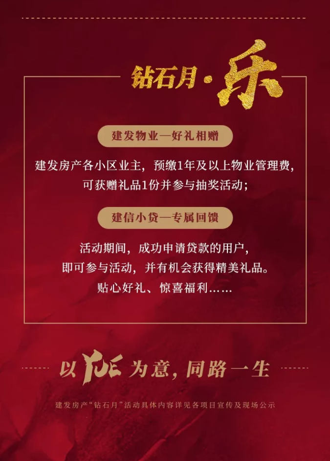 12月,建發(fā)房產(chǎn)重磅推出鉆石月回饋活動和福利,整合6大業(yè)務(wù)板塊資源,覆蓋31城市、43項目、110個社區(qū)、5大商場,呈現(xiàn)更多精彩。