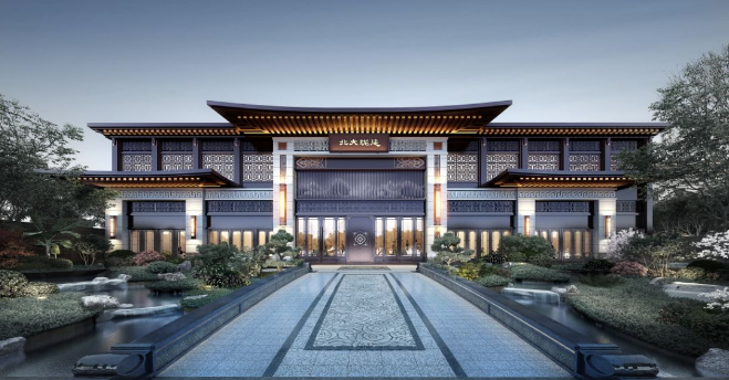 采用中軸對稱式布局,師法古典園林